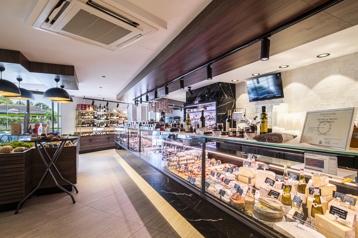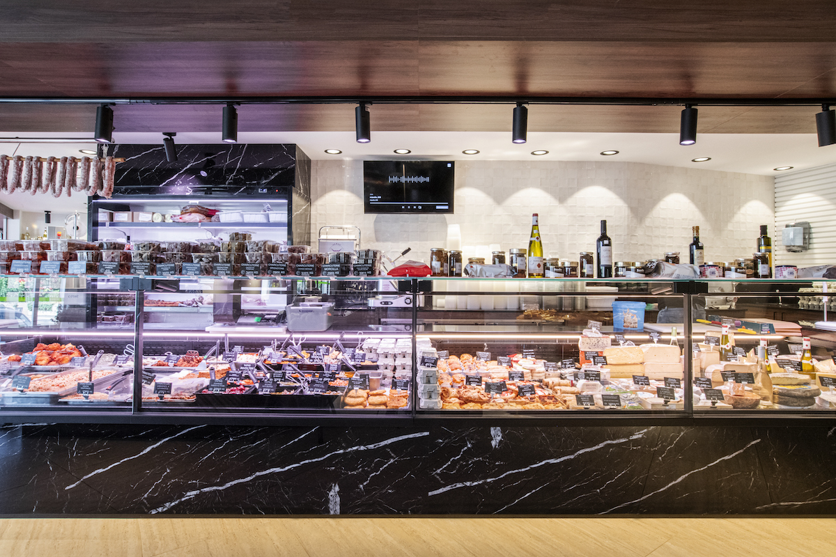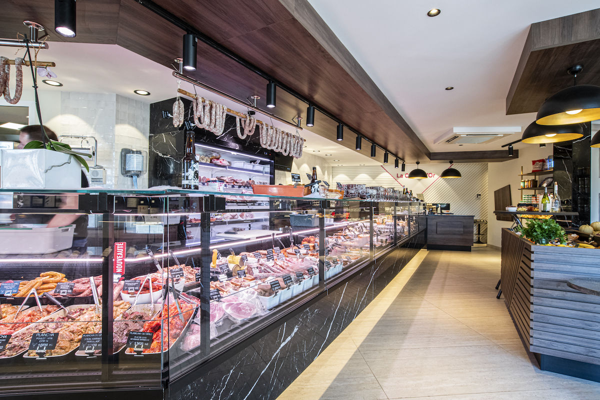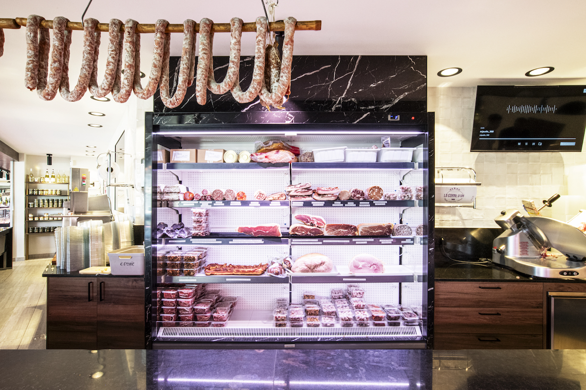 En complément de cette vitrine principale, une armoire réfrigérée ouverte a été installée à proximité immédiate de la zone de découpe. Pensée pour recevoir les pièces de charcuterie les plus volumineuses — jambons entiers, épaules, gros saucissons —, elle reprend les codes esthétiques du projet : revêtement marbre noir, lignes épurées, ouverture large et directe.