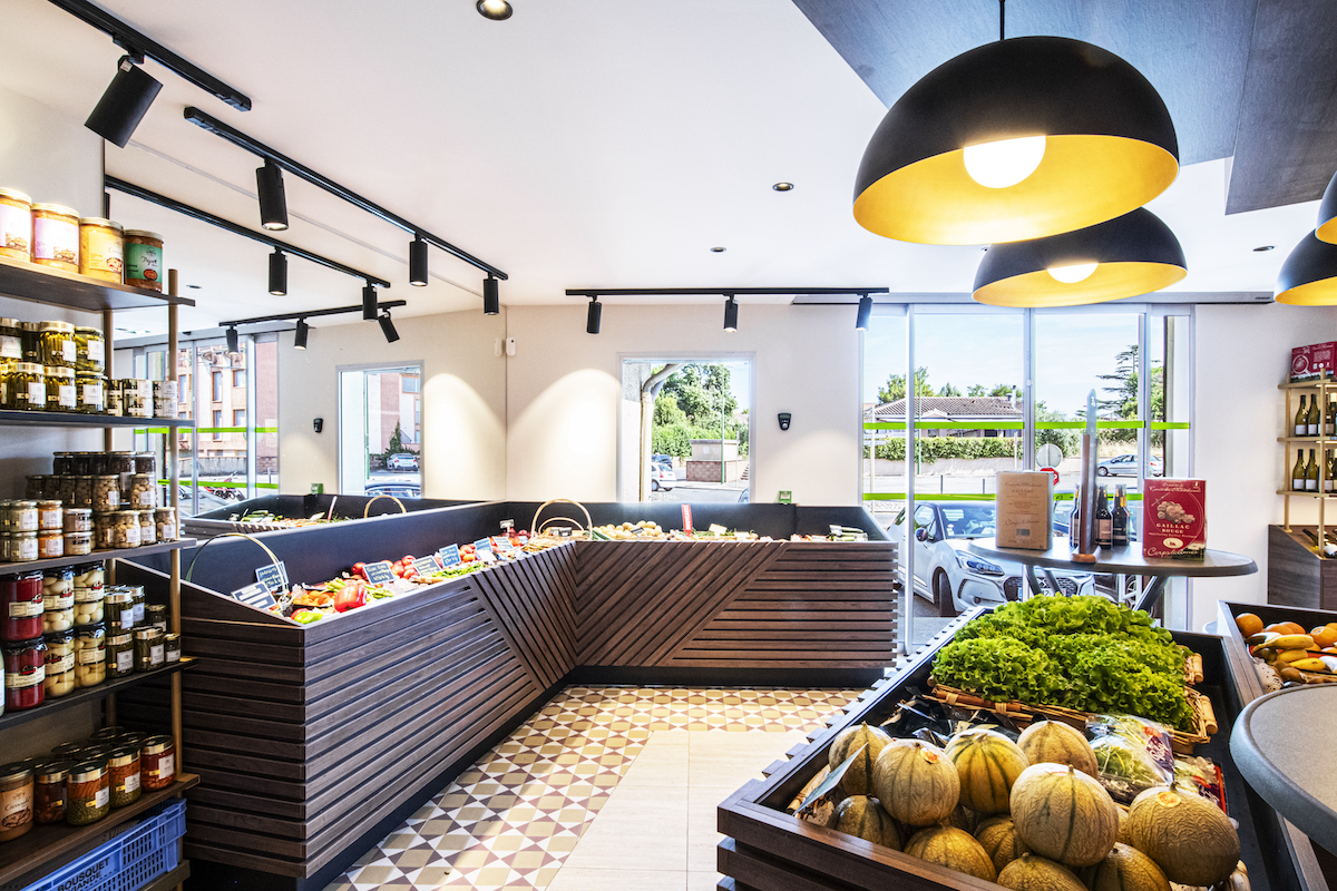 Enfin, deux meubles sur-mesure ont été dessinés pour accueillir un espace primeur en libre-service. Pensés comme des bancs paysans modernisés, ces éléments viennent ancrer encore davantage la boutique dans une logique de circuit court, de saisonnalité et de complémentarité des usages. Bois foncé, lignes sobres, volumes ouverts : le végétal s’inscrit naturellement dans l’architecture globale, sans rupture stylistique.