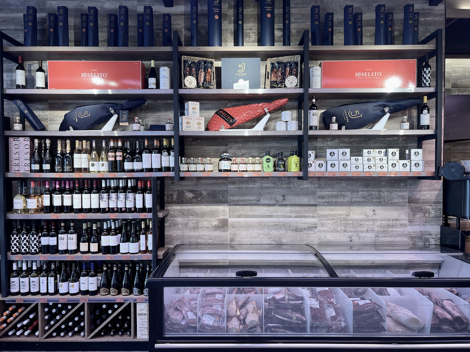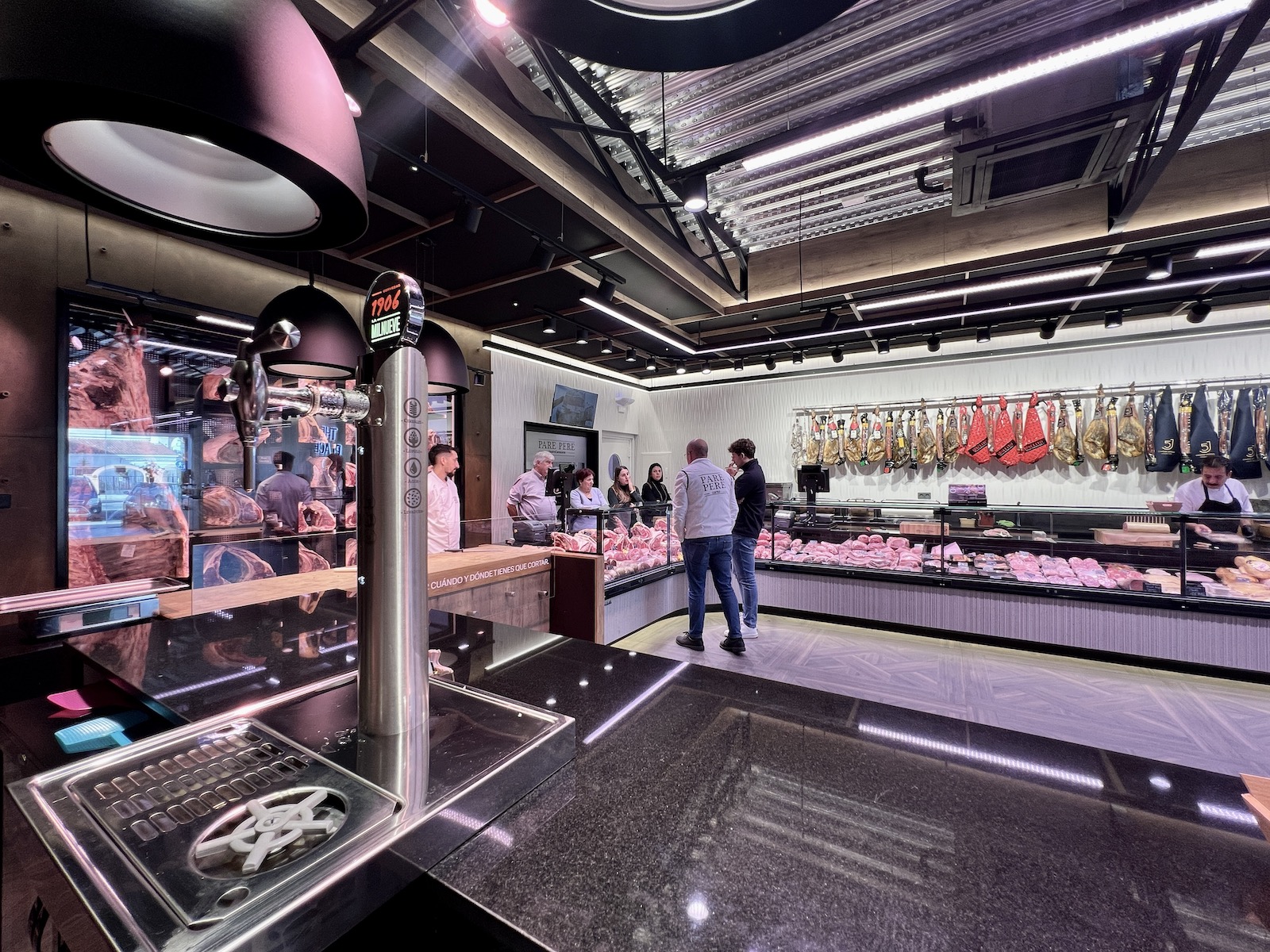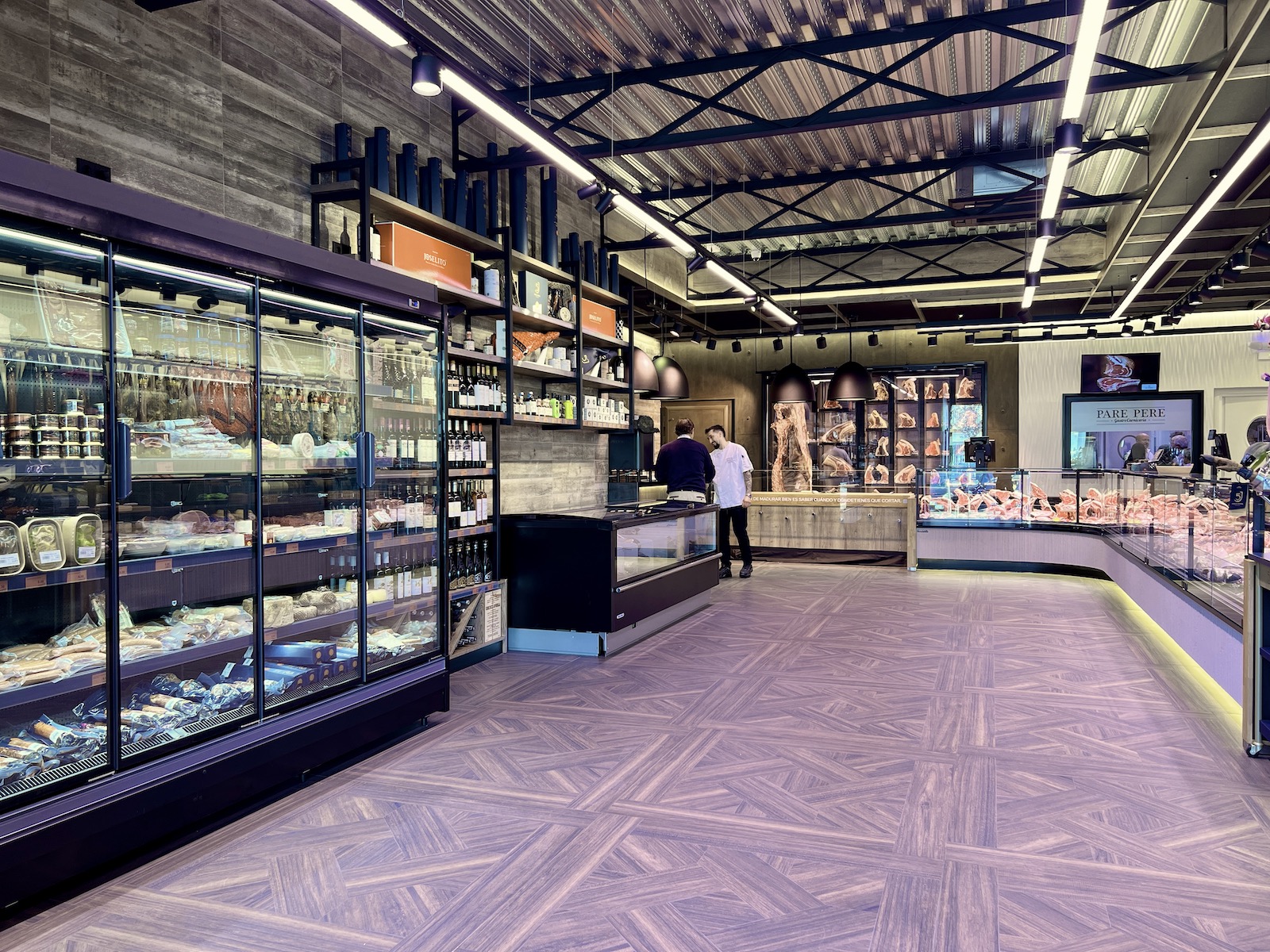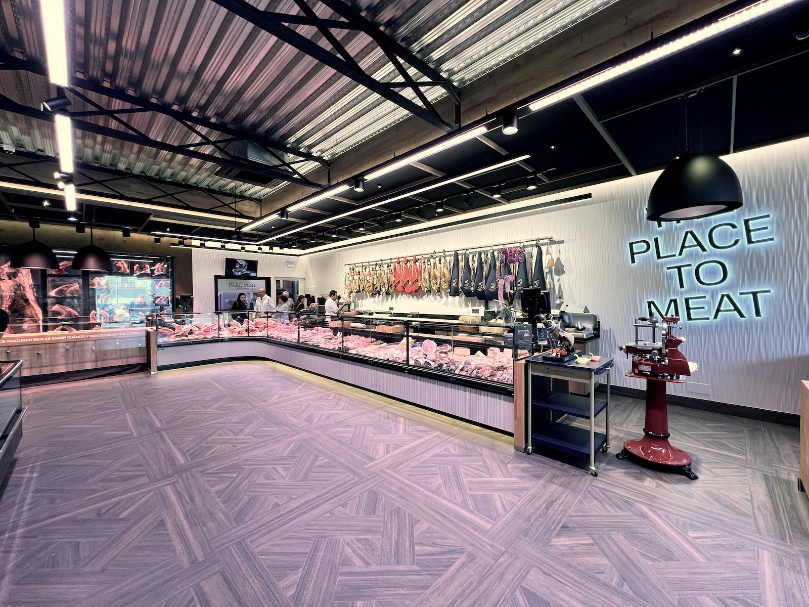 Le parcours client est fluide, intuitif, ponctué par de longues vitrines réfrigérées où s’exposent viandes maturées, charcuteries et produits d’épicerie fine. Chaque zone est clairement identifiable, avec un mobilier sur mesure qui valorise les textures naturelles : bois, métal noir et éclairages chauds.