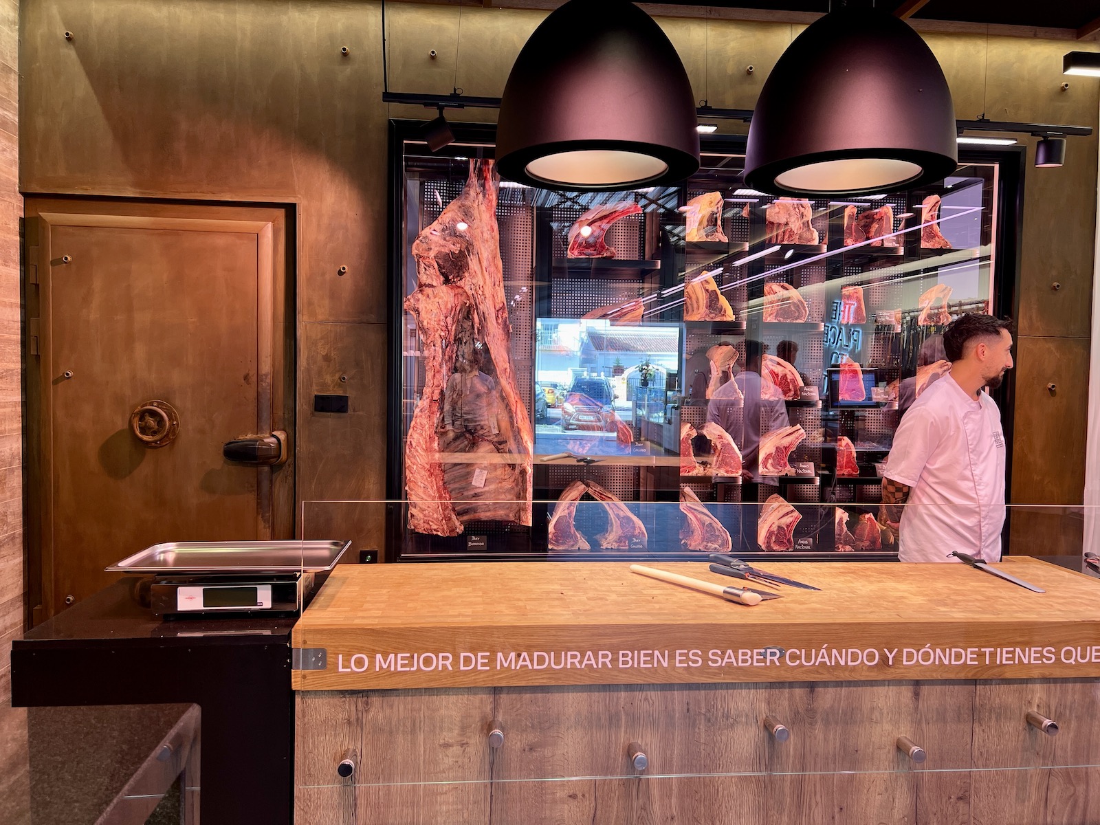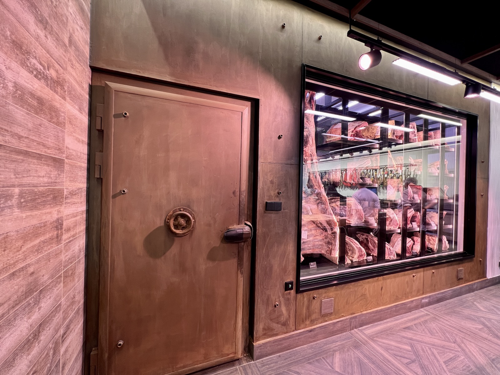 Au cœur du projet, l’imposante armoire de maturation attire tous les regards. Véritable signature visuelle, elle met en scène la viande comme une œuvre d’art.